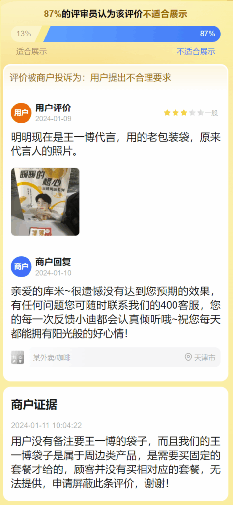 用户没有备注要王一博的袋子,而且我们的王一博袋子是属于周边类产品,是需要买固定的套餐才给的,顾客并没有买相对应的套餐,无法提供,申请屏蔽此条评价,谢谢!