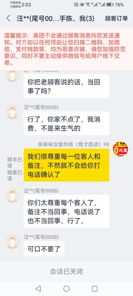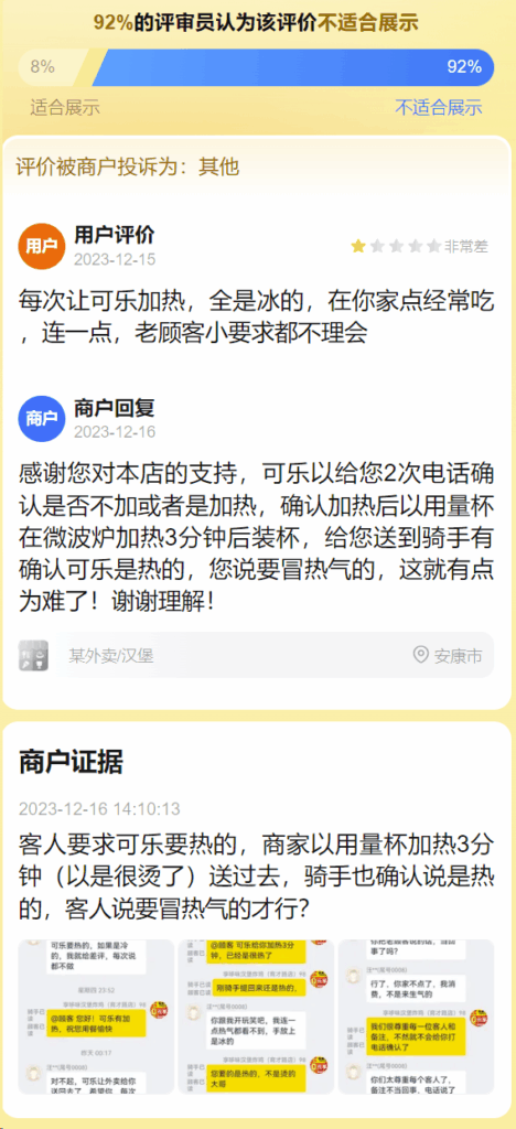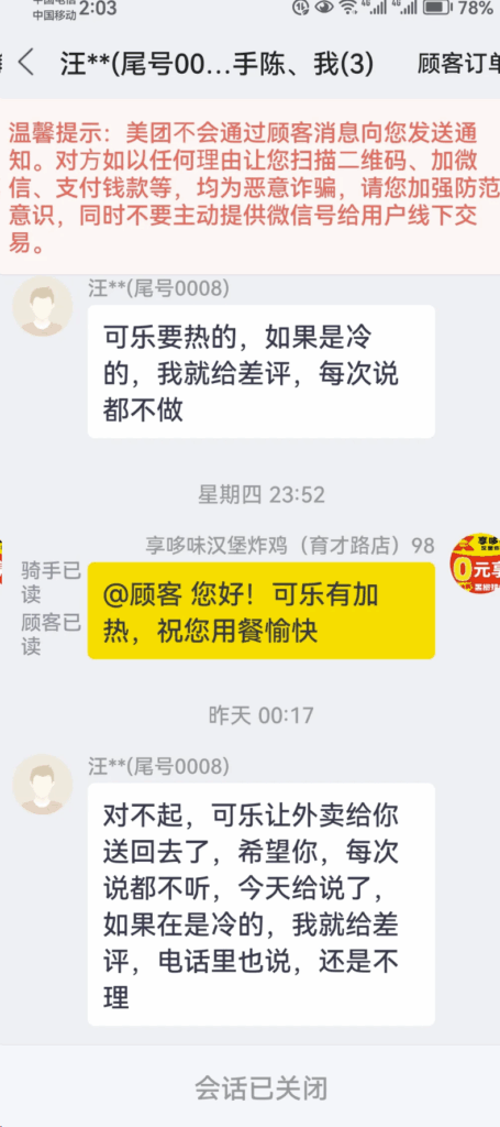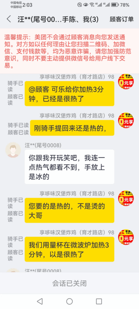 每次让可乐加热,全是冰的,在你家点经常吃,连一点,老顾客小要求都不理会
