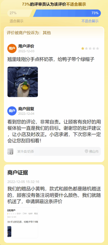我们的赠品小黄鸭,款式和颜色都是随机赠送的,顾客没有备注说明要什么颜色,我们就随机送了,申请屏蔽这条评价
