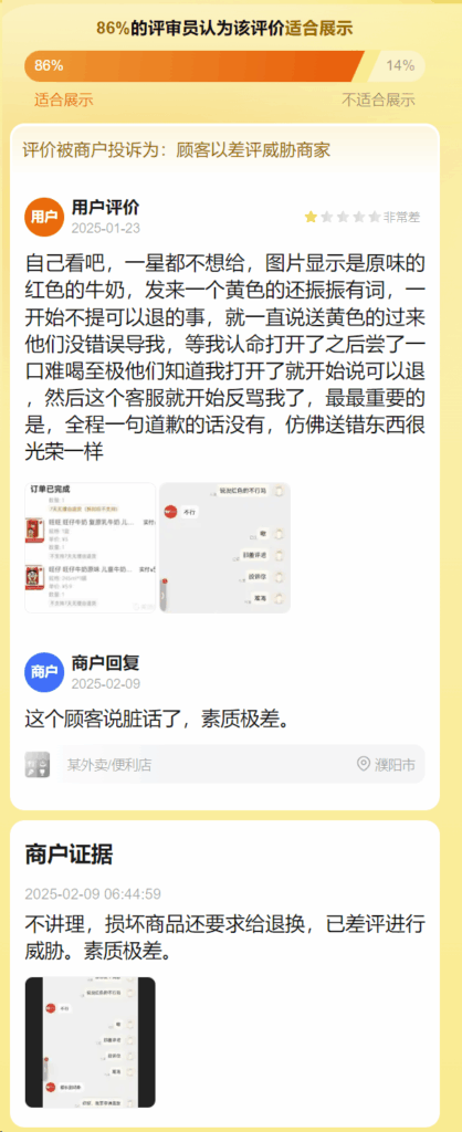 自己看吧,一星都不想给,图片显示是原味的红色的牛奶,发来一个黄色的还振振有词,一开始不提可以退的事,就一直说送黄色的过来他们没错误导我,等我认命打开了之后尝了一口难喝至极他们知道我打开了就开始说可以退,然后这个客服就开始反骂我了,最最重要的是,全程一句道歉的话没有,仿佛送错东西很光荣一样