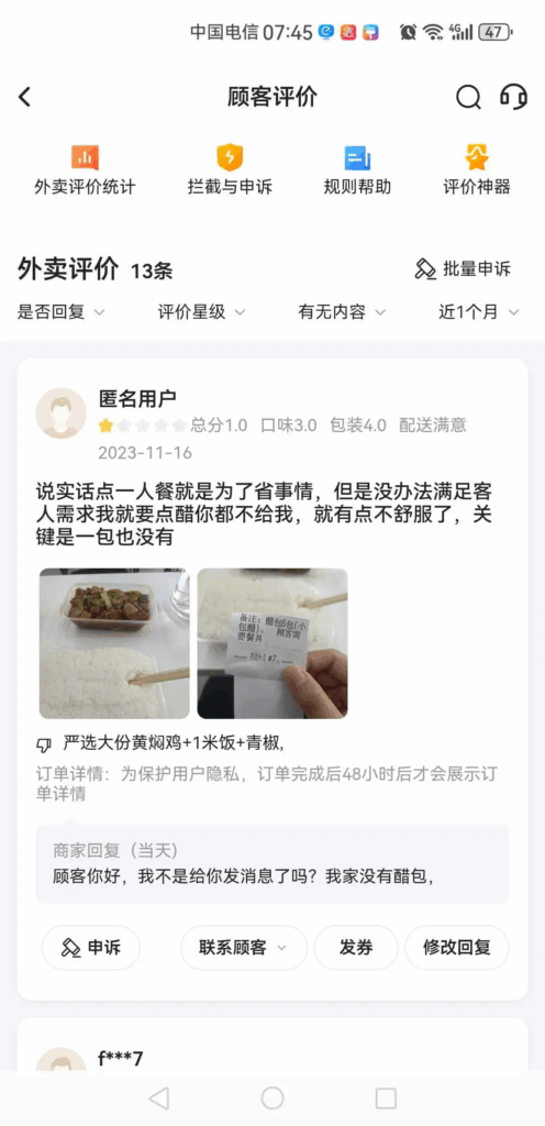 不会再有下次了,不是看都是老乡,第二次都不会点,明明知道吃面爱吃蒜,备注不看,没有也不说一声。