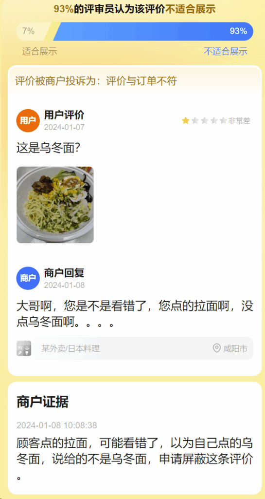 评价被商户投诉为:评价与订单不符