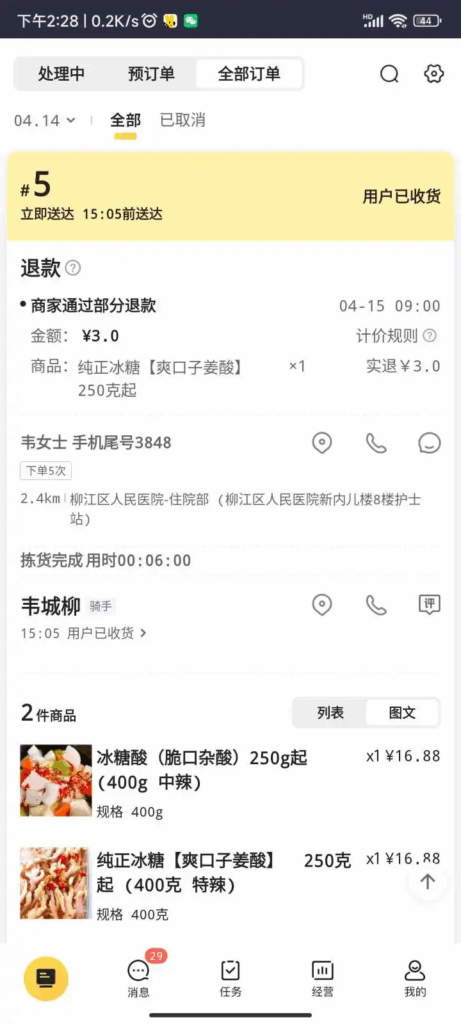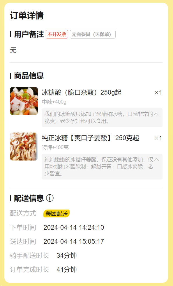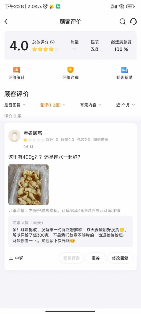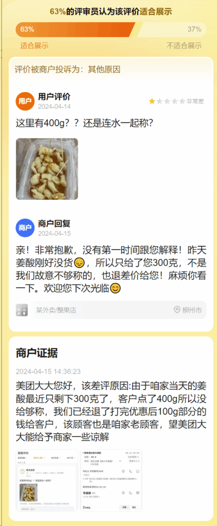 美团大大您好,该差评原因:由于咱家当天的姜酸最近只剩下300克了,客户点了400g所以没给够称,我们已经退了打完优惠后100g部分的钱给客户,该顾客也是咱家老顾客,望美团大大能给予商家一些谅解