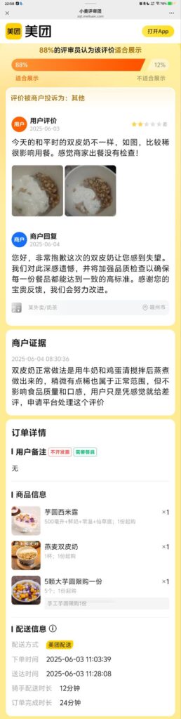 今天的和平时的双皮奶不一样,如图,比较稀很影响用餐。感觉商家出餐没有检查!