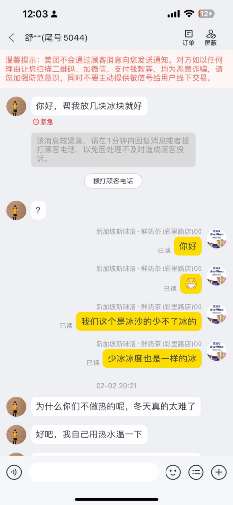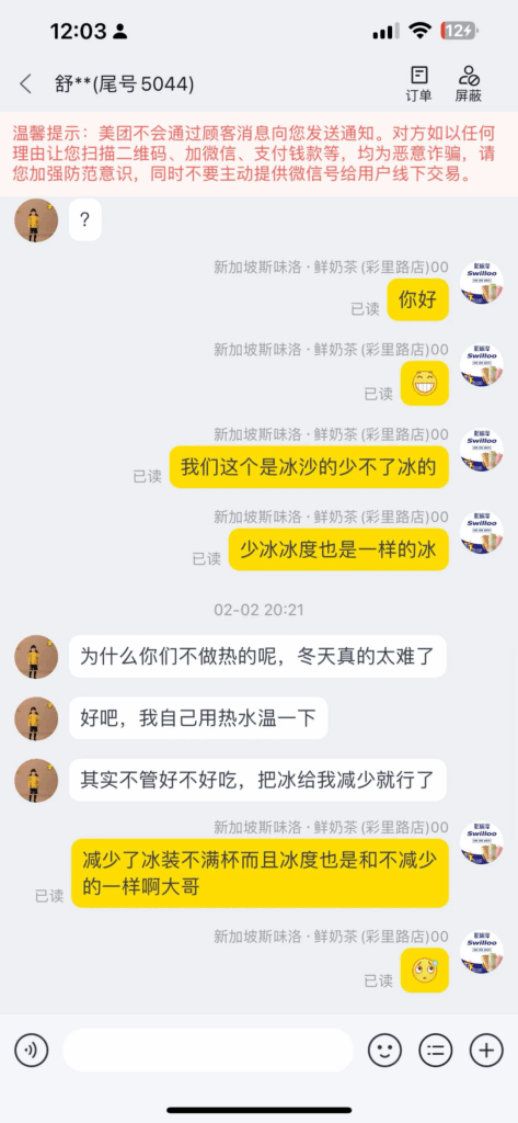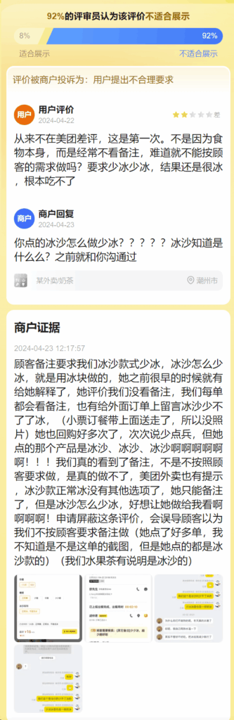 顾客备注要求我们冰沙款式少冰,冰沙怎么少冰,就是用冰块做的,她之前很早的时候就有给她解释了,她评价我们没看备注,我们每单都会看备注,也有给外面订单上留言冰沙少不了了冰,(小票订餐带上面送走了,所以没照片)她也回购好多次了,次次说少点兵,但她点的那个产品是冰沙、冰沙、冰沙啊啊啊啊啊啊!!!我们真的看到了备注,不是不按照顾客要求做,是真的做不了,美团外卖也有提示,冰沙款正常冰没有其他选项了,她只能备注了,但是冰沙怎么少冰,好想让她做给我看啊啊啊啊!申请屏蔽这条评价,会误导顾客以为我们不按顾客要求备注做(她点了好多单,我不知道是不是这单的截图,但是她点的都是冰沙款的)(我们水果茶有说明是冰沙的)