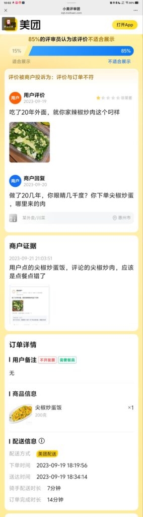 2025年8月17日 不适合展示 85%的评审员认为该评价不适合展示 用户评价2023-09-19非常差吃了20年外面,就你家辣椒炒肉这个叼样商户回复2023-09-20做了20几年,你眼睛几千度?你下单尖椒炒蛋,哪里来的肉
