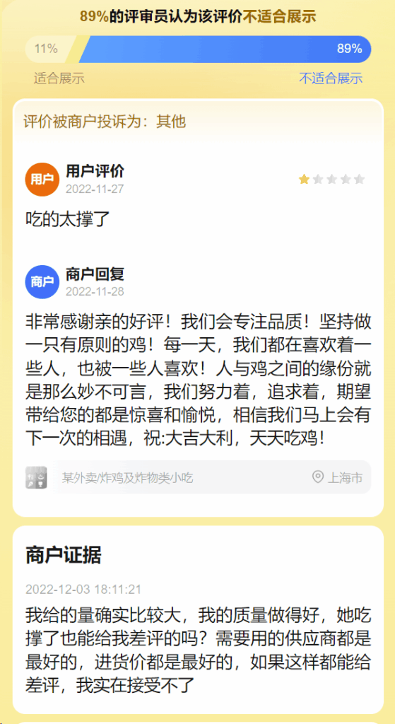 我给的量确实比较大,我的质量做得好,她吃撑了也能给我差评的吗?需要用的供应商都是最好的,进货价都是最好的,如果这样都能给差评,我实在接受不了