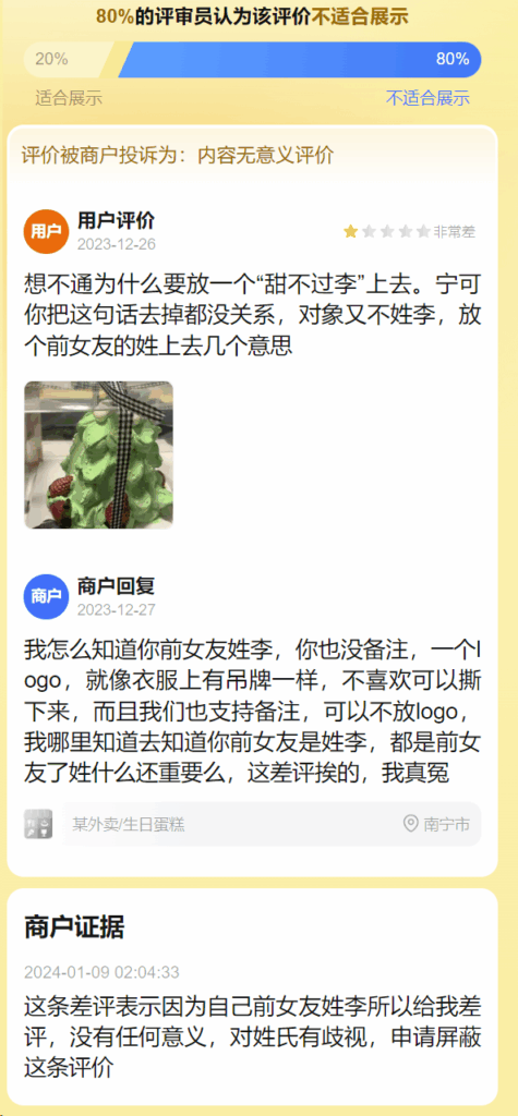 这条差评表示因为自己前女友姓李所以给我差评,没有任何意义,对姓氏有歧视,申请屏蔽这条评价
