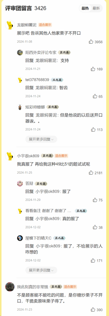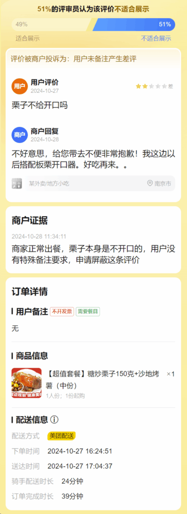 商家正常出餐,栗子本身是不开口的,用户没有特殊备注要求,申请屏蔽这条评价
