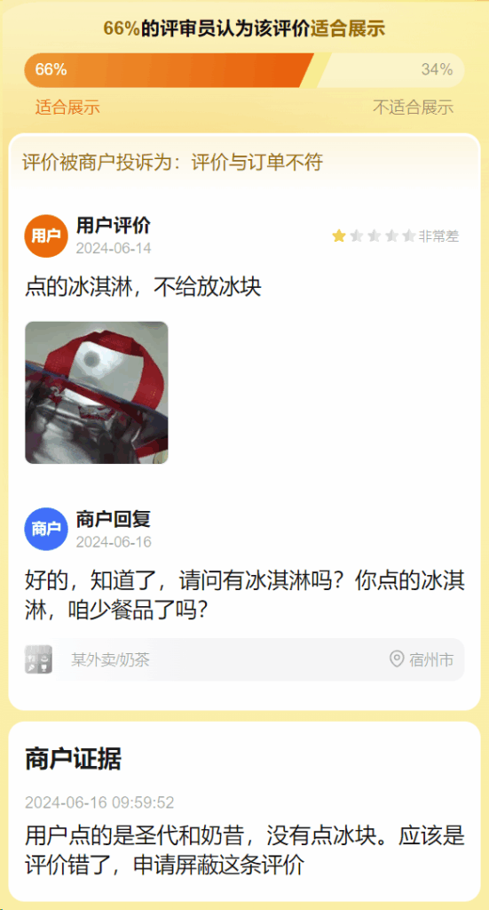 评价被商户投诉为:评价与订单不符
