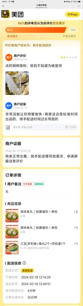 2025年8月17日 适合展示 86%的评审员认为该评价适合展示 用户评价2024-02-18差点的明明是粉,收到不知道为啥是饼商户回复2024-02-19非常没能让你用餐愉快~商家这边是标准时间出品的,骑手配送时间过长导致的
