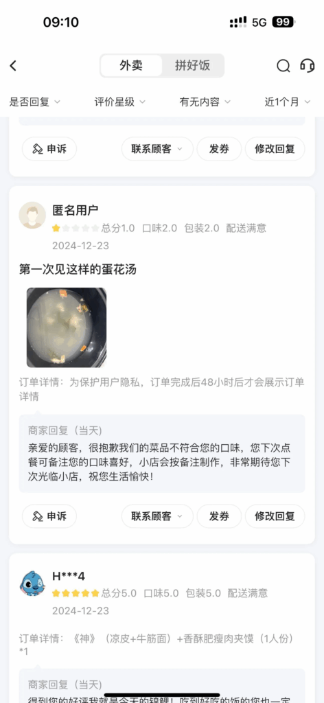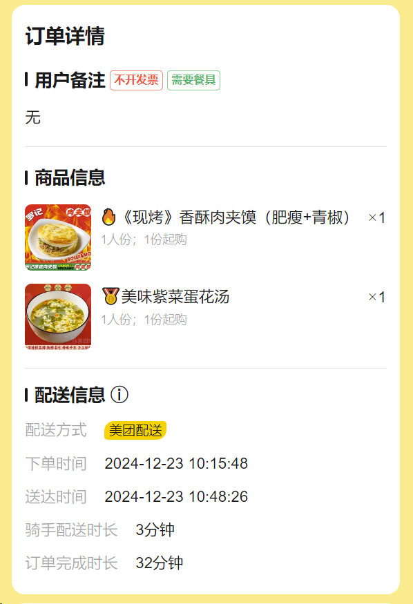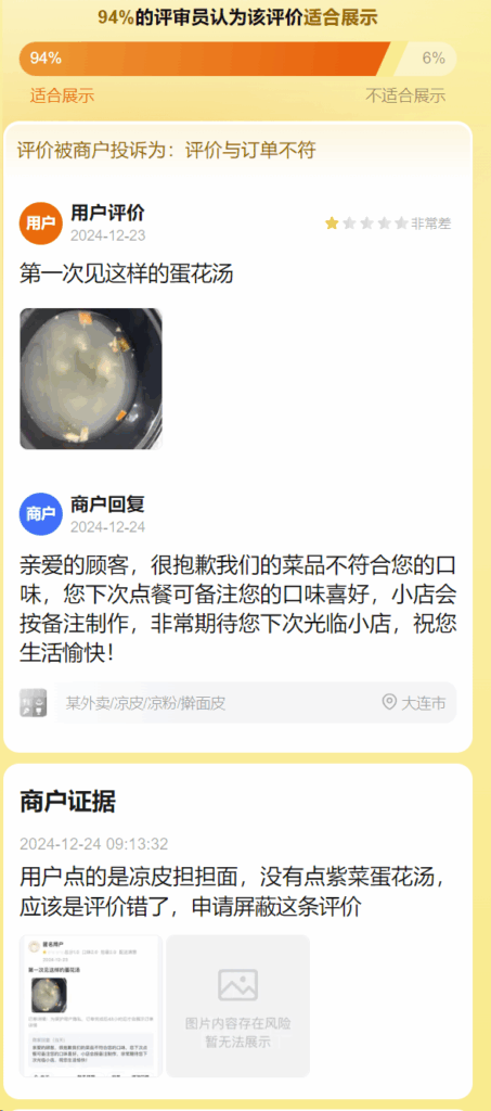 用户点的是凉皮担担面,没有点紫菜蛋花汤,应该是评价错了,申请屏蔽这条评价